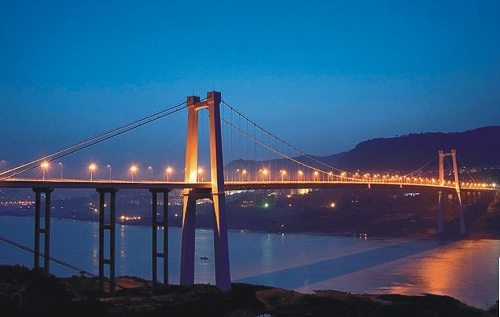重慶萬州長江二橋 全長1148.86米,主跨580米,鋼桁梁懸索橋,2003年6月建成通車。獲2008年國家優(yōu)質(zhì) 工程銀獎(jiǎng)。