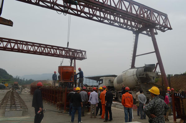 為迎接首梁澆筑的特大喜事,在烈日下項目部管理人員早早來到預制場觀摩翹首以待,他們還特意在龍門吊上懸掛了炮竹;此刻操作工人正在做最后檢查調(diào)整,個個精神飽滿、蓄勢待發(fā)。上午9時,第一輛混凝土罐車緩緩駛進預制場,現(xiàn)場一聲令下,鞭炮齊鳴,澆筑施工正式開始?,F(xiàn)場技術(shù)員準確的將罐車引導來到梁場,工人迅速支好料斗,罐車司機熟練地將混凝土閘閥打開,料斗瞬間裝滿后龍門吊徐徐升起落點到箱梁之上,混凝土積蓄著力量順流而下注入模板,發(fā)出清脆的金屬撞擊響聲,和著嗡嗡作響的振動棒聲,像是一場宏大的交響音樂,旁邊的看客時時歡呼與之交相輝映,場面顯得格外的熱鬧,澆筑施工順利進行。經(jīng)過現(xiàn)場有序組織,運輸罐車接踵而至,持續(xù)2小時的澆筑施工在高效優(yōu)質(zhì)的勝利完成。