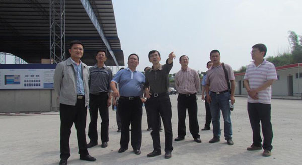 謝副市長(前中)在四川路橋成貴鐵路項目經(jīng)理部黨支部書記夏勇(前左一)陪同下參觀一分部標(biāo)準(zhǔn)化拌和站。