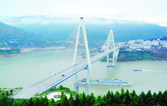 巴東長江公路大橋:建設(shè)總長2100米,橋長900.5米,主跨388米,為五跨連續(xù)雙塔雙索面預(yù)應(yīng)力砼斜拉橋。橋面寬19米(不含錨索區(qū)),設(shè)四車道及兩側(cè)各1.5米寬的人行道,北主塔高212米,時(shí)居同類型橋...