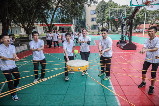 “核彈危機”、“細水長流”、“擊鼓顛球”、“七巧板”、“飛盤運動”5個極具挑戰(zhàn)性的項目,在教練的解說下,各組隊員之間開始分工配合、通力合作,你拉我一把、我推你一掌,各小隊之間也是鉚足了力、憋足了勁,你追我趕,相互競進,只爭第一。