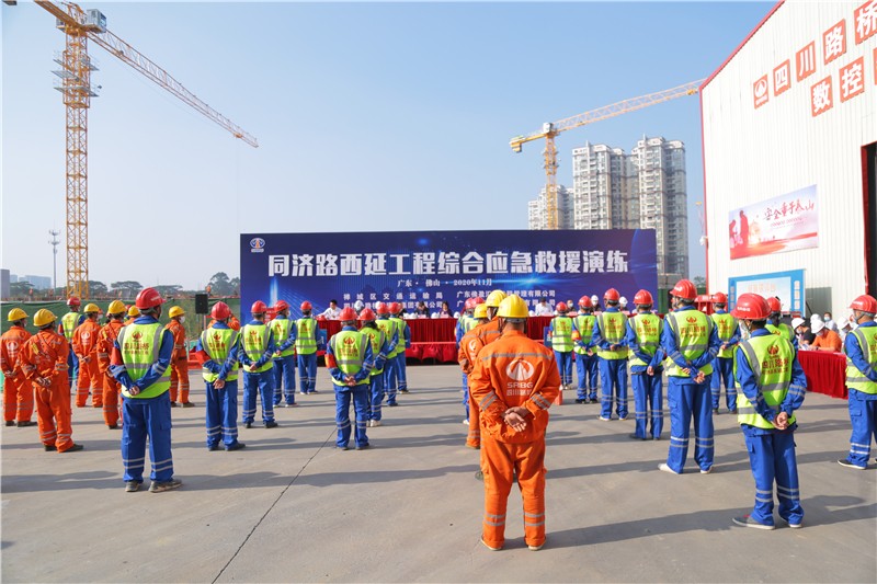為認(rèn)真貫徹落實(shí)佛山市禪城區(qū)交通運(yùn)輸局印發(fā)《佛山市禪城區(qū)交通運(yùn)輸局(區(qū)軌道交通局)突發(fā)事件應(yīng)急管理工作規(guī)范》和《佛山市禪城區(qū)交通運(yùn)輸行業(yè)突發(fā)事件總體應(yīng)急預(yù)案》的文件精神,不斷提高項(xiàng)目應(yīng)對(duì)突發(fā)事件的應(yīng)急保障能力。2020年11月24日下午15:30,同濟(jì)路西延工程組織開(kāi)展了2020年綜合應(yīng)急救援演練,禪城區(qū)交通運(yùn)輸局質(zhì)管科科長(zhǎng)葉峰、安全科副科長(zhǎng)邱建萍、交建科副科長(zhǎng)尚建國(guó)、廣東佛盈匯建工程管理有限公司總經(jīng)理胡英豪、副總經(jīng)理陳金水、胡永強(qiáng)、總工程師姜同輝、佛山市第一人民醫(yī)院禪城醫(yī)院及建設(shè)單位管轄的其他在建公路工程、市政工程、水利工程、房建工程的監(jiān)理單位總監(jiān)及施工單位項(xiàng)目經(jīng)理等七十余人到場(chǎng)觀(guān)摩指導(dǎo)。