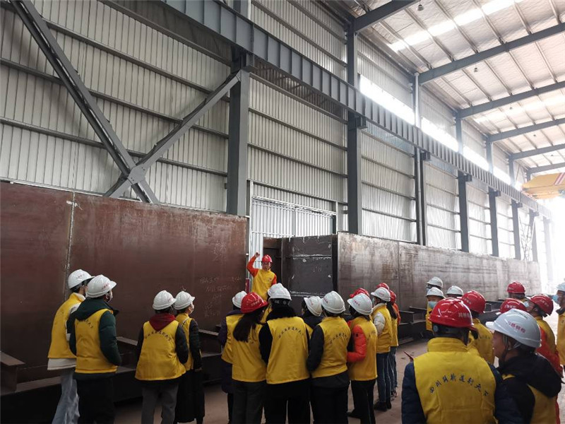 全體人員首先在生產(chǎn)車間,就近期加工的金簡仁項目鋼箱梁加工、檢測、吊裝等細致交流。加工廠技術人員王瑞向大家介紹講解加工全流程情況。作為公司幾大主營下屬單位,加工廠作為大型鋼結構加工廠家,和業(yè)務包含鋼結構檢測的檢測公司,以及設備管理的機具站,活動人員借此機會不斷提問、交流、分享。
