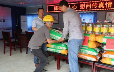 6月1日上午,項(xiàng)目經(jīng)理郭勇、黨支部書記李地霍帶著項(xiàng)目部購買的粽子、大米、食用油以及清涼油、藿香正氣水等節(jié)日慰問品和防暑降溫品來到施工現(xiàn)場,將項(xiàng)目部的關(guān)愛送到每一位參建員工的心中。