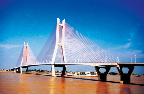 湖北鄂黃長江大橋全長3245米,主橋長1290米,主跨480米,主塔高172.3米,五跨連續(xù)雙塔雙索面預(yù)應(yīng)力砼斜拉橋,其主跨居同期同類橋梁亞洲第二、世界第三,2002年9月建成通車。其施工創(chuàng)造了一年完成水下基礎(chǔ)并提前一年完工的長江中下游特大橋施工記錄,被交通部譽為“長江大橋建設(shè)的典范”。獲2004年四川省天府杯金獎、2006年國家優(yōu)質(zhì)工程銀獎等榮譽。